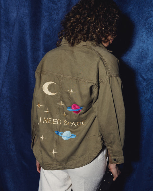 “ I NEED SPACE” embroidered Denim Shacket in Olive (LAST PIECE)